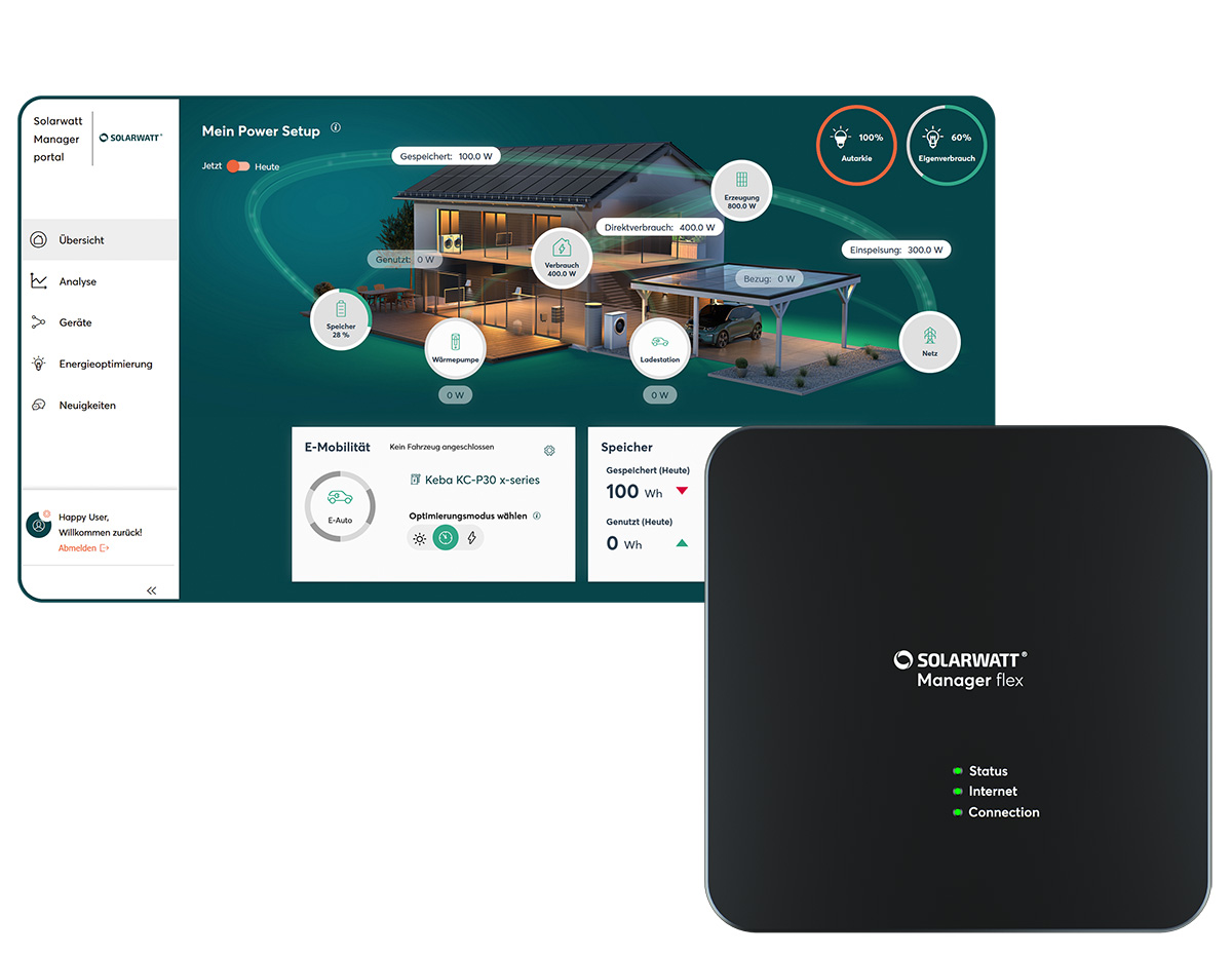 Der SOLARWATT Manager flex optimiert nicht nur einzelne Stromabnehmer, sondern das ganze System und macht Ihr Energiemanagement noch effizienter. Sie haben stets alle Energieflüsse und Geräte im Blick.